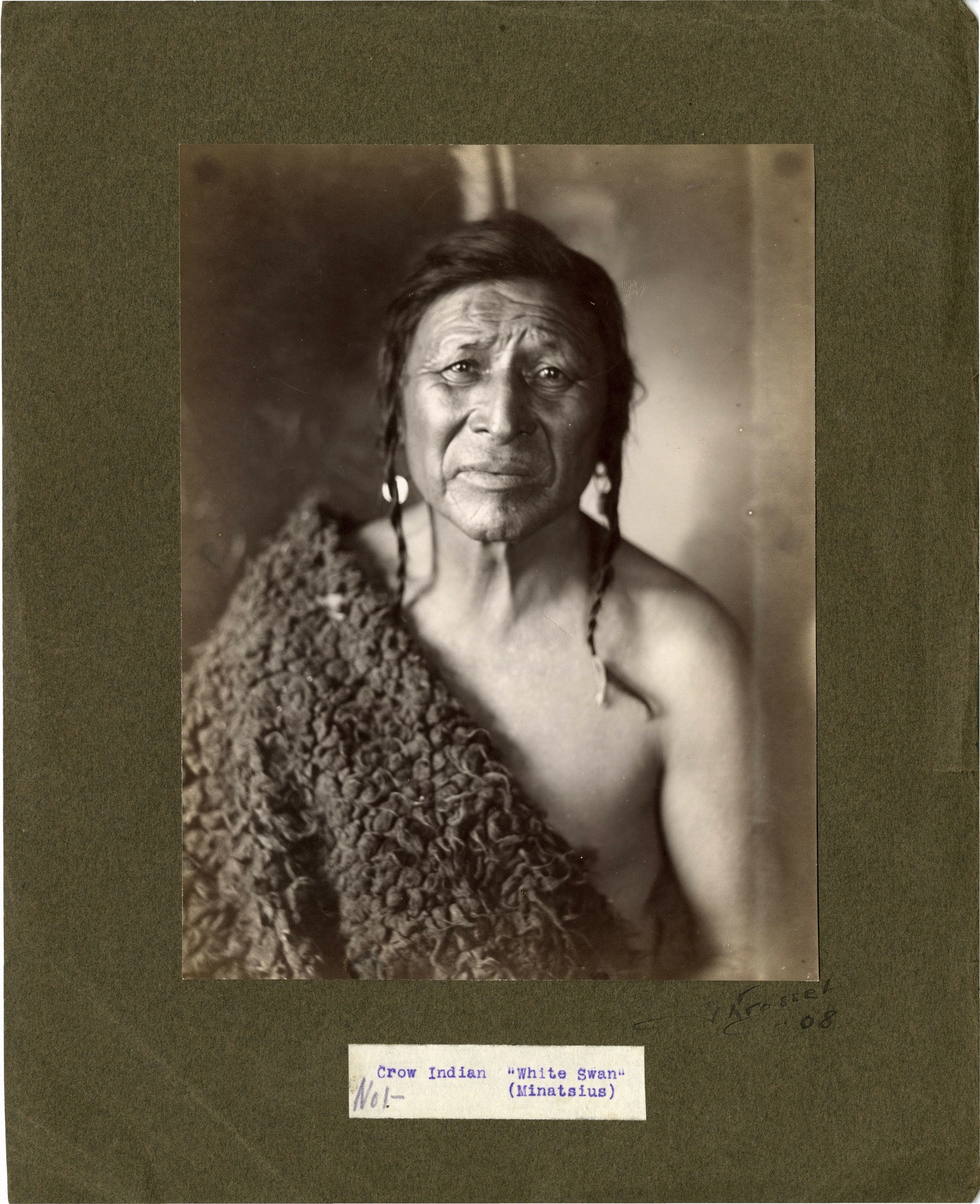 LIBI_00312_11183; Mounted photo. This portrait depicts White Swan, a Crow Scout. He is shirtless, with a buffalo robe draped over his right shoulder. There is one feather in his hair. A white label attached to the mount reads: “No 1- Crow Indian White Swan (Minatsius). A signature under the lower right corner reads: “Throssel 08”. This image was produced by Richard Throssel in 1908. It is the original image. ; print;Courtesy of the National Park Service, Little Bighorn Battlefield National Monument, LIBI_00312_11183, Richard Throssel, "White Swan in a Buffalo Robe," 1908