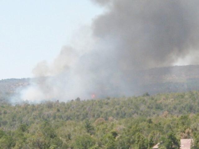 These photographs black smoke and flames as the fire builds and moves toward buildings on the first day of the Long Mesa Fire. They were taken from Chapin Mesa, most likely from the top of the water tank (which later burned).