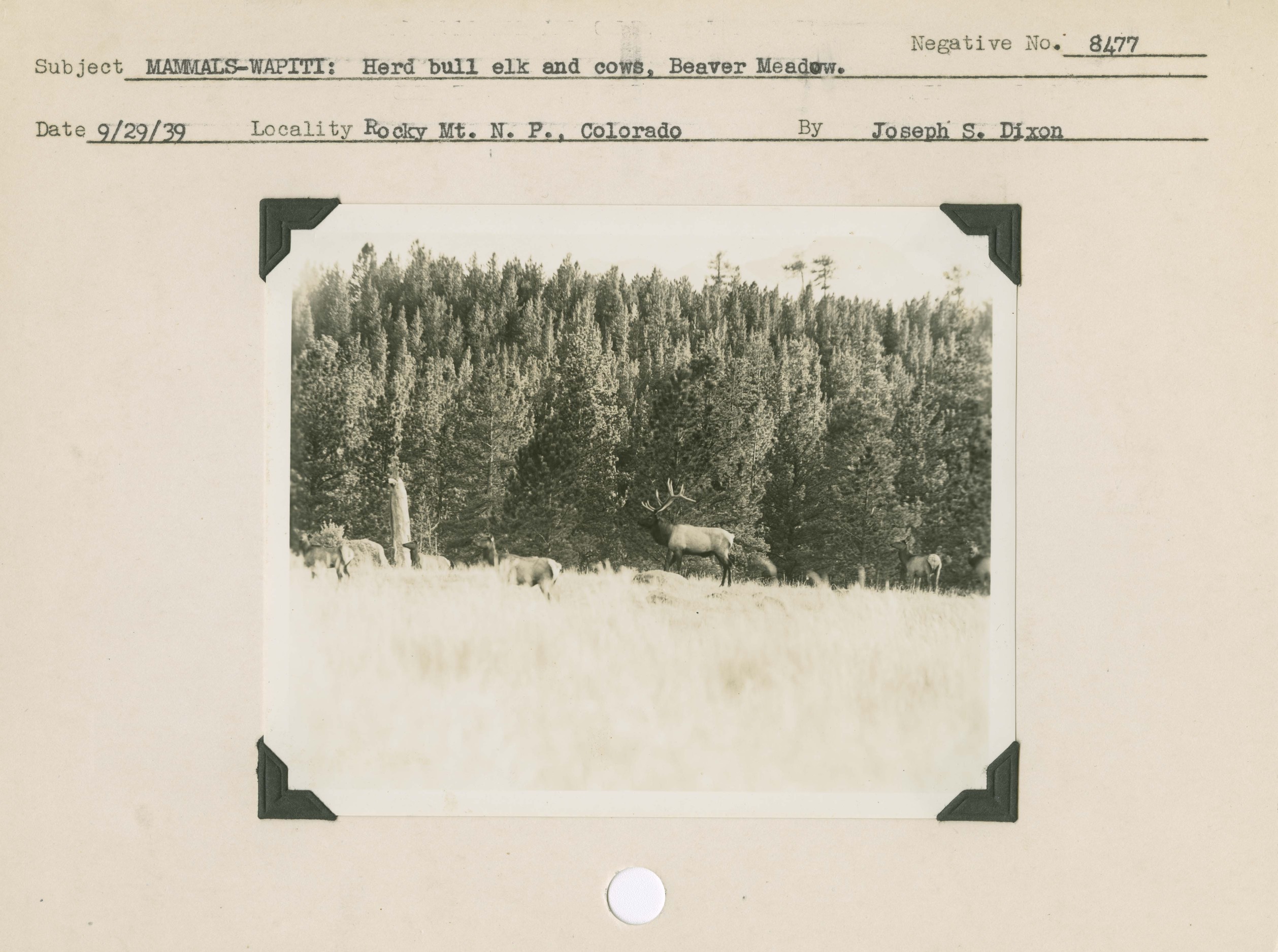 Mammals -- Wapiti [Elk]: Herd bull elk and cows, Beaver Meadow. Negative #: 8477. Locality: Rocky Mountain National Park, Colorado.