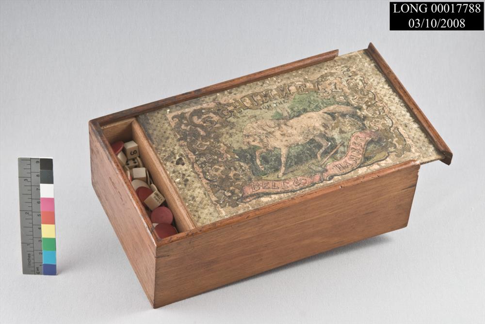 SCHIMMEL OR BELL & HAMMER. <CRA) BROWN WOOD BOX.<CRB) FLAT LID SLIDES OUT OF TOP OF BOX. TITLE, WHITE HORSE SURROUNDED BY TREES ON LID. <CRC) RULES CARD. <CRD) 5 CARDS: HAMMER, BELL, INN, WHITE HORSE, BOY & GIRL RINGING BELL. CARDS HAVE GILDED DECORATIONS. <CRE) 2 DICE. <CRF) 6 DICE, EACH W/5 BLANK SIDES & 1 OF: 6, 8, 1, 4, BELL, OR HAMMER. <CRG) GREEN, WHITE, RED COUNTERS. "No 9" AND "74/75" WRITTEN IN PENCIL ON BOTTOM OF BOX, "SCHIMMELL..." ON STICKER.