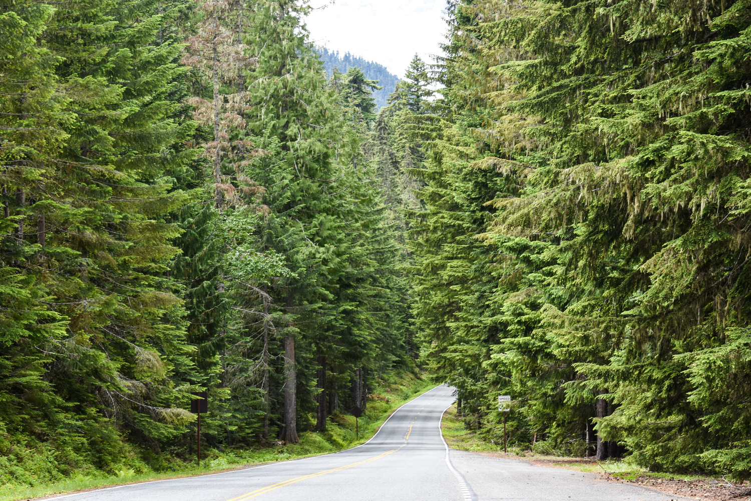 A road curves between the trees on the way to Sunrise.