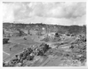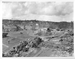 The rubbled village of Sumay is converted into an unloading depot for marine aviation supplies shortly after the recapture of the former American base. Japanese snipers hid in the cave pocked cliff in the background, Orote Peninsula.