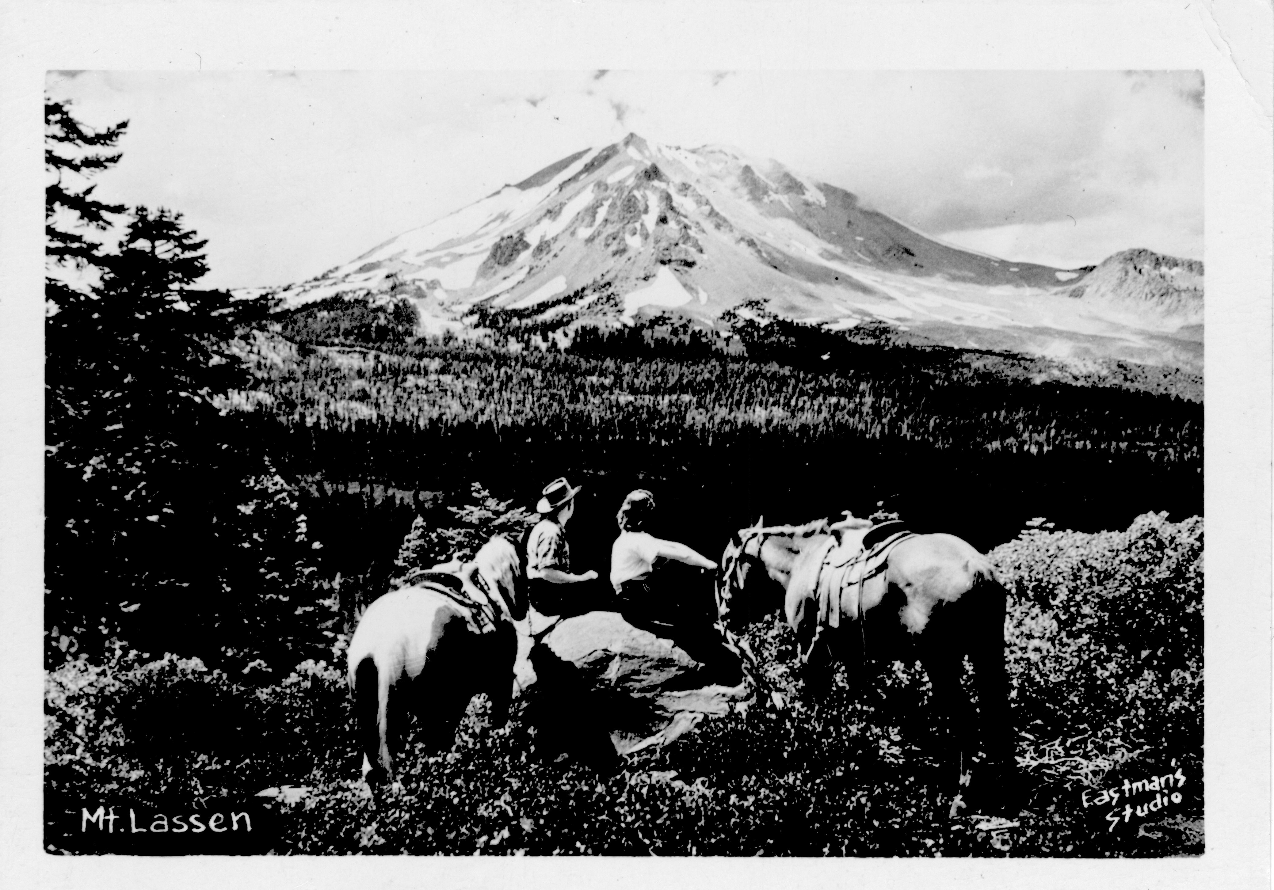 Chief Ranger Richard N. Book Photographic Collection: Man and woman with horses sitting on rock observing view of Lassen Peak. Photograph by Eastman’s Studio.