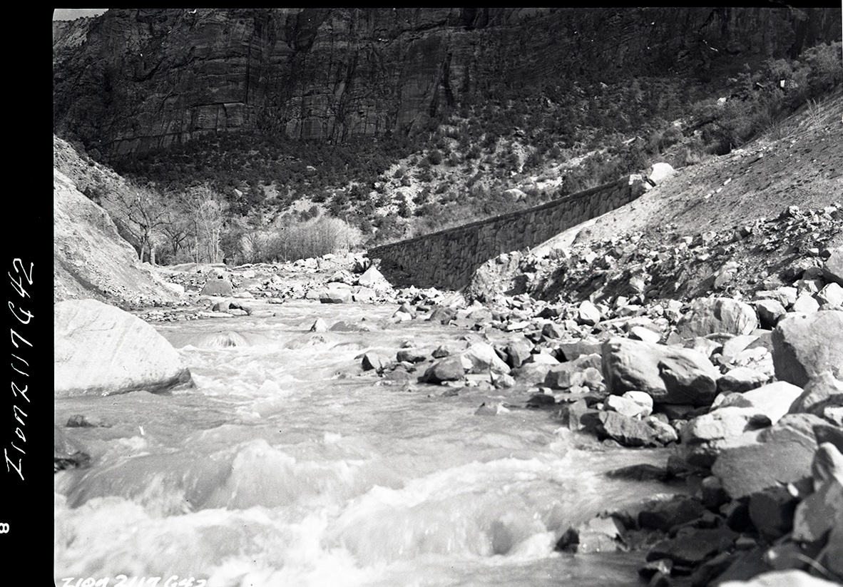 Rock retaining wall alongside the road at the slide area in Zion Canyon. ; ZION Museum and Archives Image 002_03012 ; ZION 13289