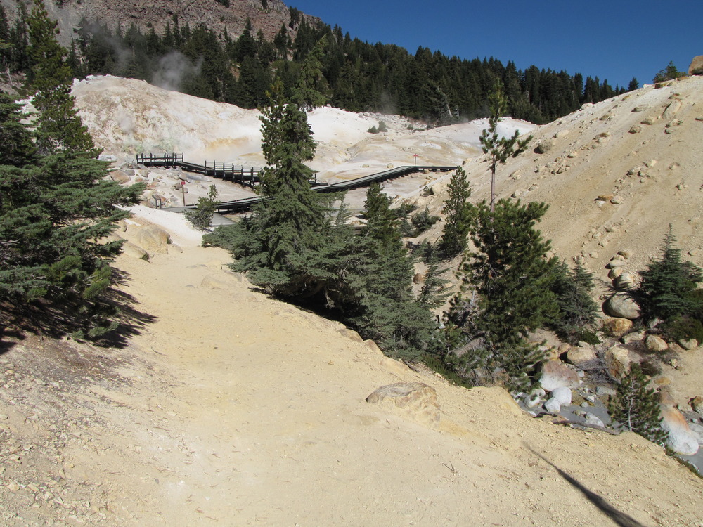 The trail entering the Bumpass Hell hydrothermal area past a creek.