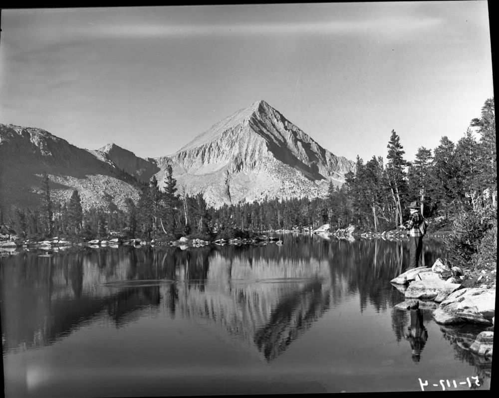 Howard Stagner, 510000, Bench Lake, KCNP, Fishing, Supt. Scoyen fishing, Arrow Peak in back-ground. Misc. Lakes, Misc. Peaks.