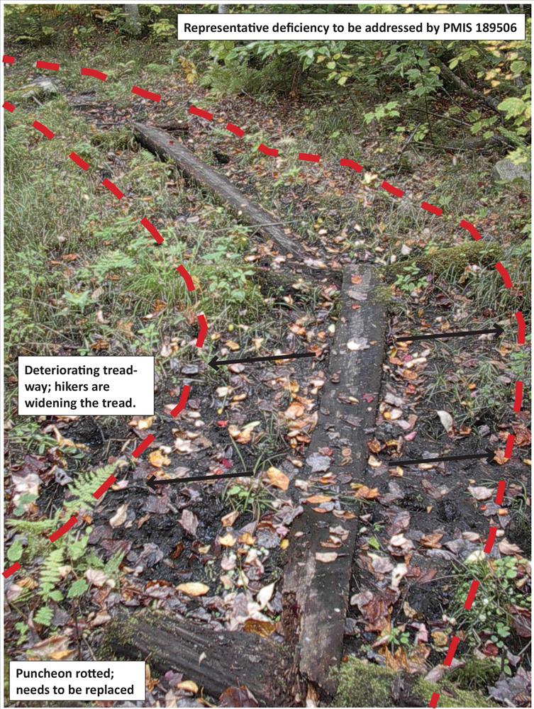Example of deteriorated treadway due to insufficient drainage along the N.H. section of the A.T.