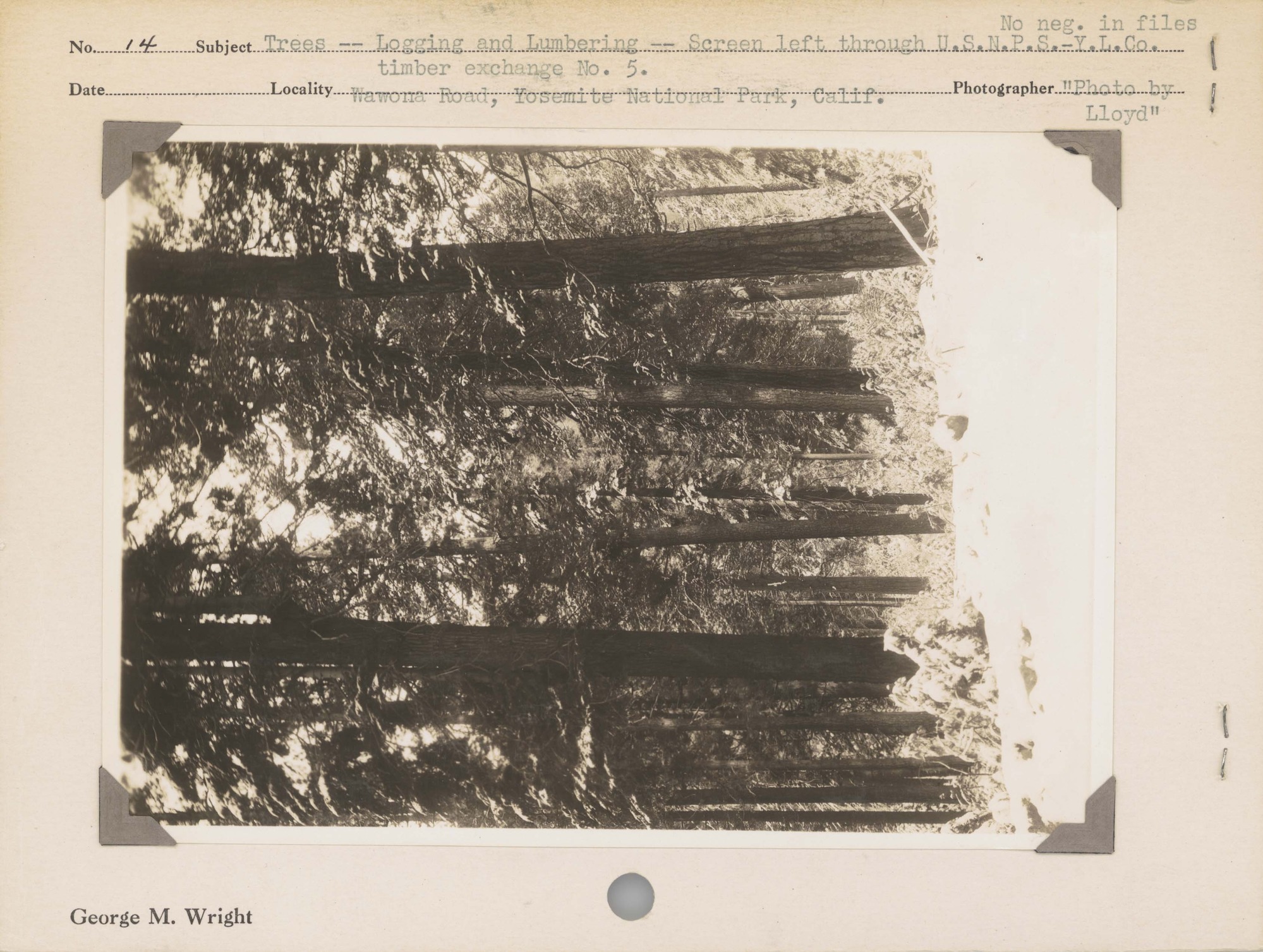 Trees – Logging & Lumbering: Screen left through United States National Park Service -- Yosemite Lumber Company timber exchange number 5. No negative on file. Photographer: “Photo by Lloyd”. Locality: Wawona Road, Yosemite National Park, California. [The date for this negative comes from the first image in this series of photographs, hfca_1607_iva_027_36_031_noneg01_a].
