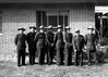 Rangers in uniform standing with Rudy Lueck (third from left) and Carl E. Jepson (second from right) outside Mission 66 Visitor Center and Museum and headquarters. Superintendent Warren F. Hamilton at far right. ; ZION Museum and Archives Image ZION 9549 ;