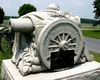 1 of 110 mns in Park honoring services of PA units in Gettysburg Campaign. Marks position held by Hapmton Battery on July 2, 1863. Located on S side of Wheatfield Rd at Peach Orchard, E of Emmitsburg Rd. || MN & 2 cannons. Smooth base, 4'8", shaft, 2'7", topped w/ bronze sculpture of artilleryman w/ sponge. All 10'11" high. Bronze trophy on W. ID tablet on S. Inscription tablet on N. 1 Cannon each on E & W sides.