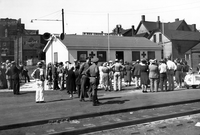 Black and white photo of a crowd of people around a white building with a Red Cross logo on the front of the building on the railroads.