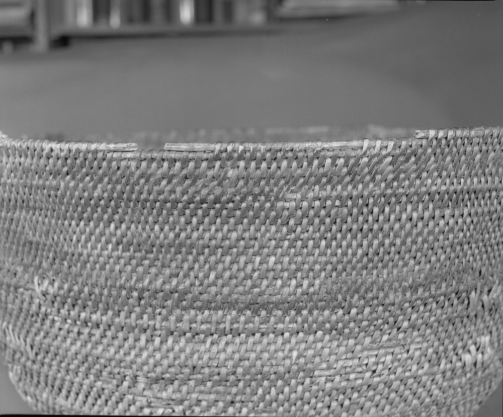 Private Collection. Object: Miwok basket. Dimensions: 9 1/2 x 4 1/2 x 8". Materials: Scraped shoots, split shoots, bracken fern root, and cotton string. Technology: Diagonally twined, up to right slant of turns, alternate rows with alternate slant. 1/3 of