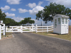 A white, board fence crosses from one grassy road shoulder to another. A closed double gate hangs over the paved road. At right, there is a small white-frame guard shack. The upper half is nearly all windows.