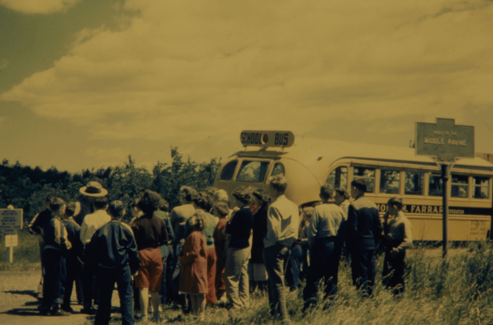 NPS employee talking to a school group by a school bus in Saratoga National Historical Park.