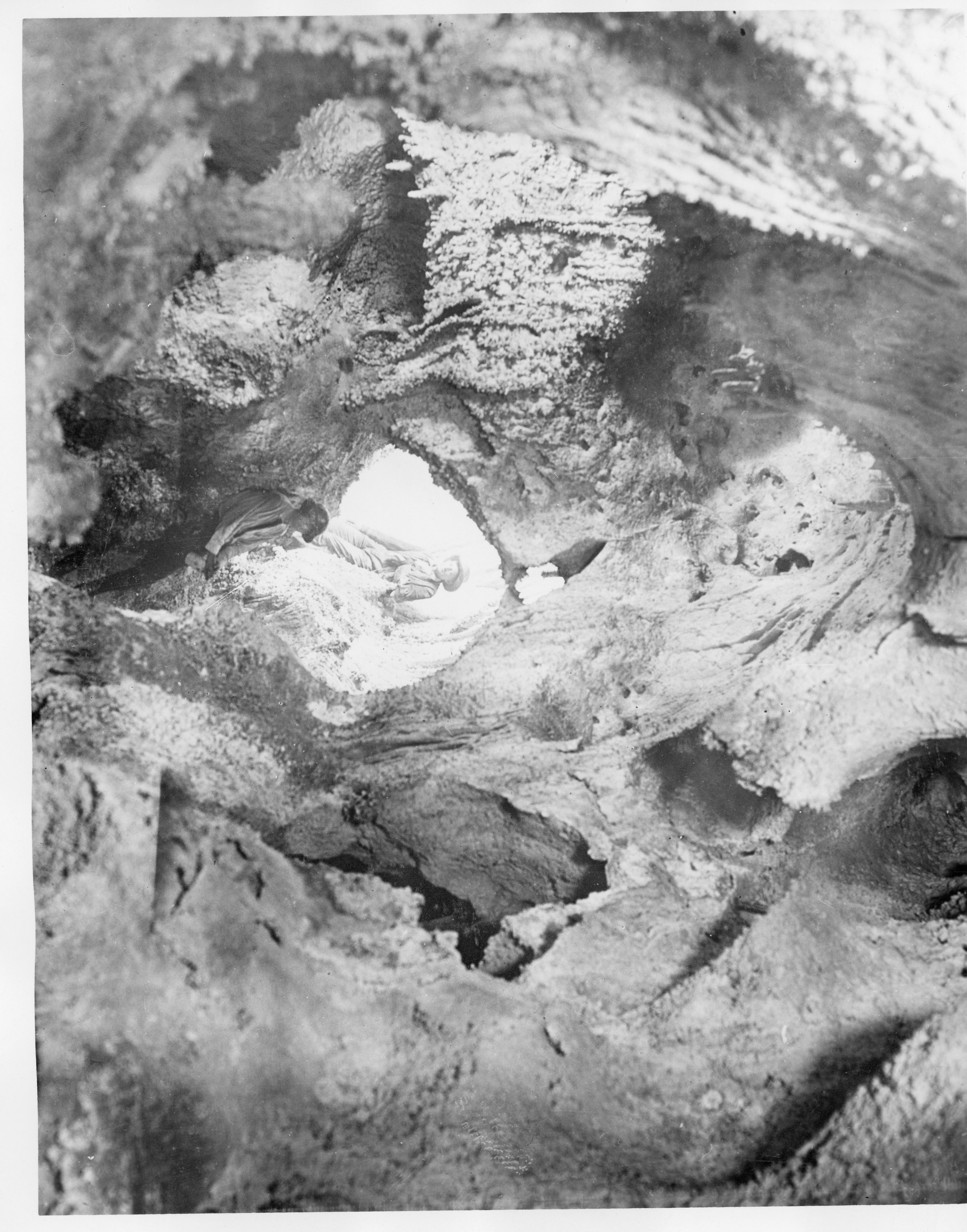 A black and white photograph of two people leaning up against formations to a lighted rock entrance.