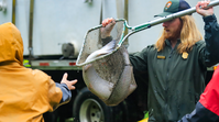 A NPS employee helping to carry fish to the river.