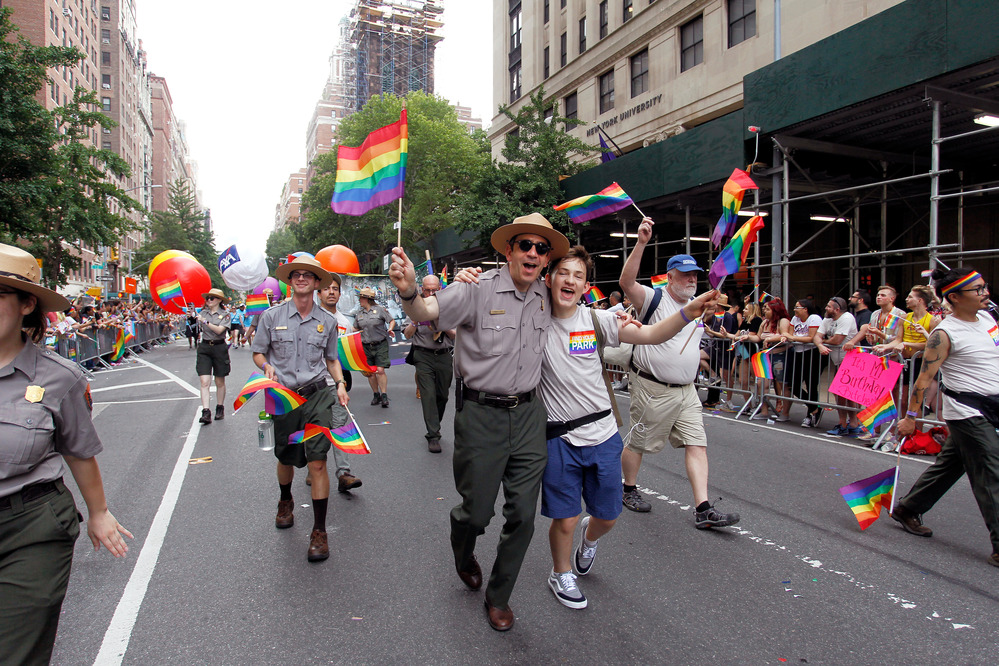 Stonewall National Monument: National Park Service employees march with family members and friends in the 49th annual Pride parade in New York City June 24, 2018.
