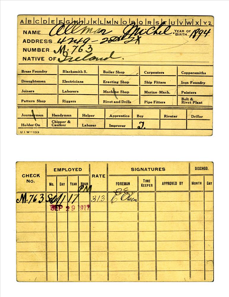 Union Iron Works Co. employee card for Michel Allmar
