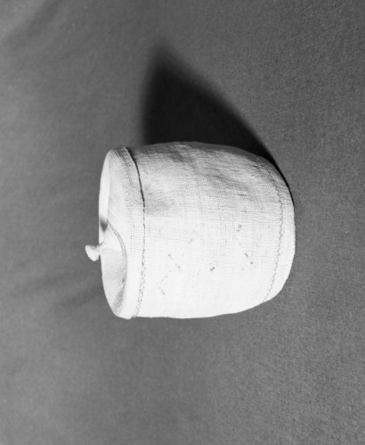 Private Collection. Object: Miwok basket. Dimensions: 9 1/2 x 4 1/2 x 8". Materials: Scraped shoots, split shoots, bracken fern root, and cotton string. Technology: Diagonally twined, up to right slant of turns, alternate rows with alternate slant. 1/3 of