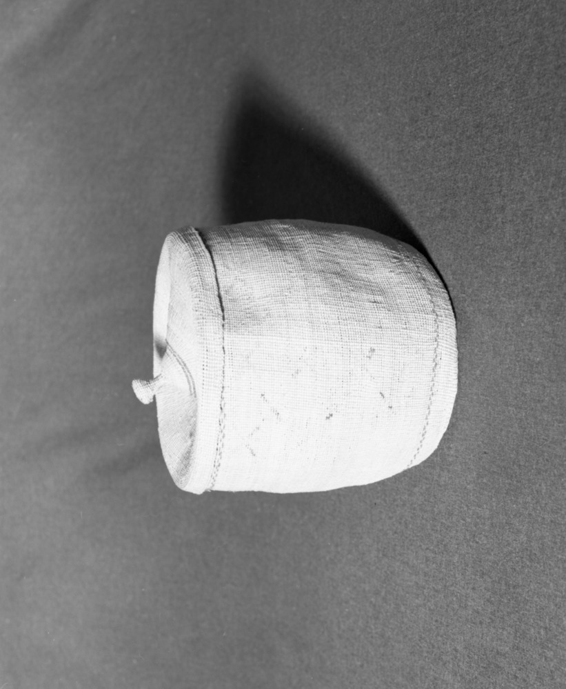 Mrs. Geraldine McConnel Collection. Object: Miwok basket. Dimensions: 9 1/2" x 4 1/4". Materials: Willow, black cotton cloth. Technology: Clockspring start, non-interlocking stitch. Collection History: Acquired from a Portuguese family that lived in Sonora