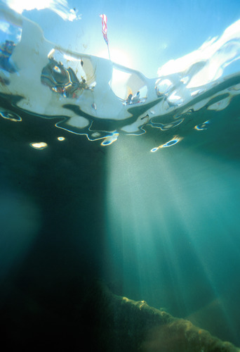 Looking up through the water to the Memorial from the deck of the ship, with sunlight streaming through the water.