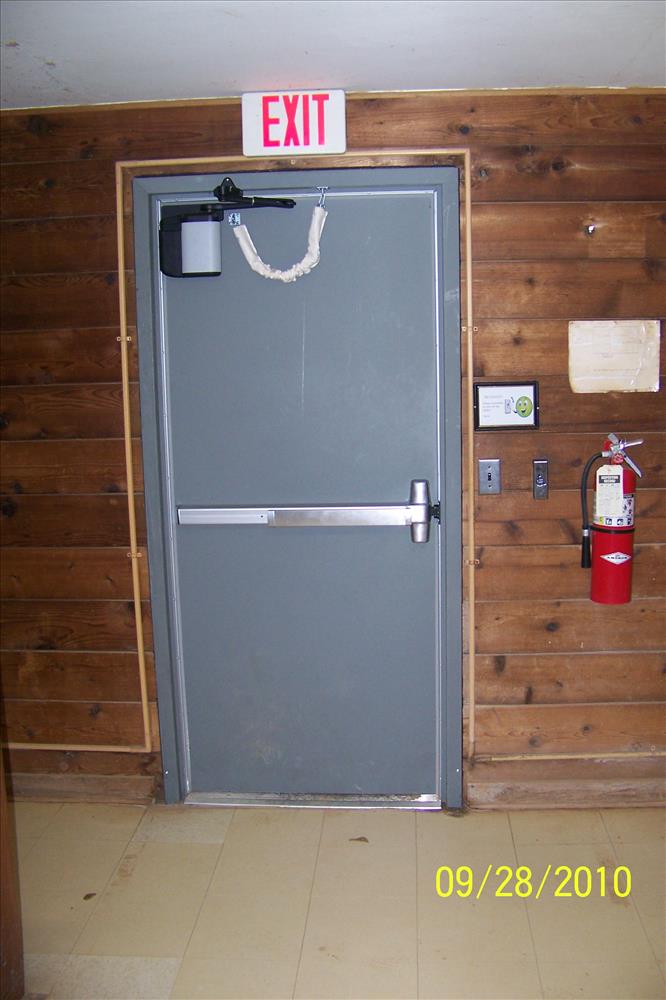 looking at interior of new door showing panic hardware on dorm B14