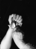 Le-me showing method of grinding clambshell beads. [(Photo mounted upside down) - in "Monthly Supt. Reports" April 1940].