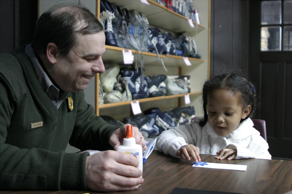 Children make crafts with Park Ranger Paul Motts inside the Winter Sports Shelter. Families enjoy hot drinks. SCA intern provides information to visitors. || During the winter months, the Kendall Lake Shelter becomes CVNP's Winter Sports Center. Services include cross-country ski and snowshoe rentals and winter recreation programs.