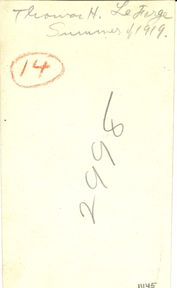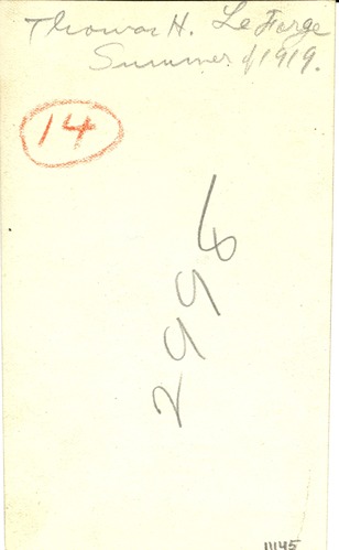 LIBI_00312_11145; Print; portrait in full length view, left profile. This image depicts Thomas LaForge. He is wearing a fringed leather jacket decorated with warriors on horses. He also wears fur gaiters. A handwritten note in pencil on the verso reads: “Thomas H. LeForge Summer of 1919”. The number “14” is written in red and circled. This image was created by an unknown photographer in summer of 1919. ; print;Courtesy of the National Park Service, Little Bighorn Battlefield National Monument, LIBI_00312_11145, Unknown Photographer, "Thomas LaForge in a Leather Jacket," Summer of 1919