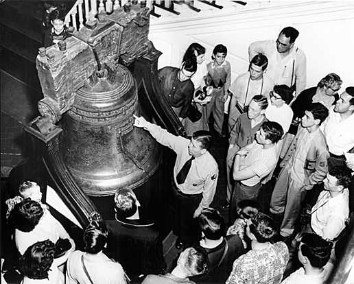 Patriotism and love of country are stimulated at shrines of American freedom, such as at Independence Hall. Here a group of attentive visitors hear the story of the famous Liberty Bell. Independence National Historical Park.