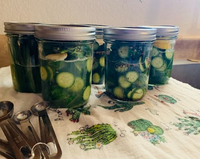 mason jars of pickles sitting on a tablecloth next to measuring spoons