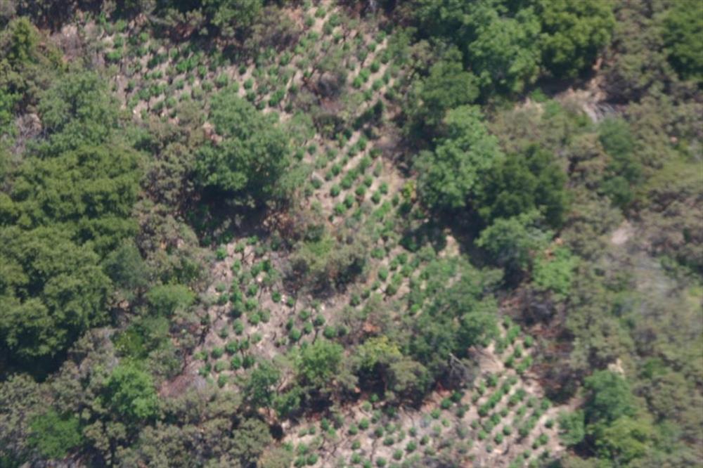 Aerial and ground views of marijuana cultivation sites in Pacific West Region parks from 2006-2008 showing vegetation clearing, chemicals, hillside terracing, weapons, and growers posing with poached bear.