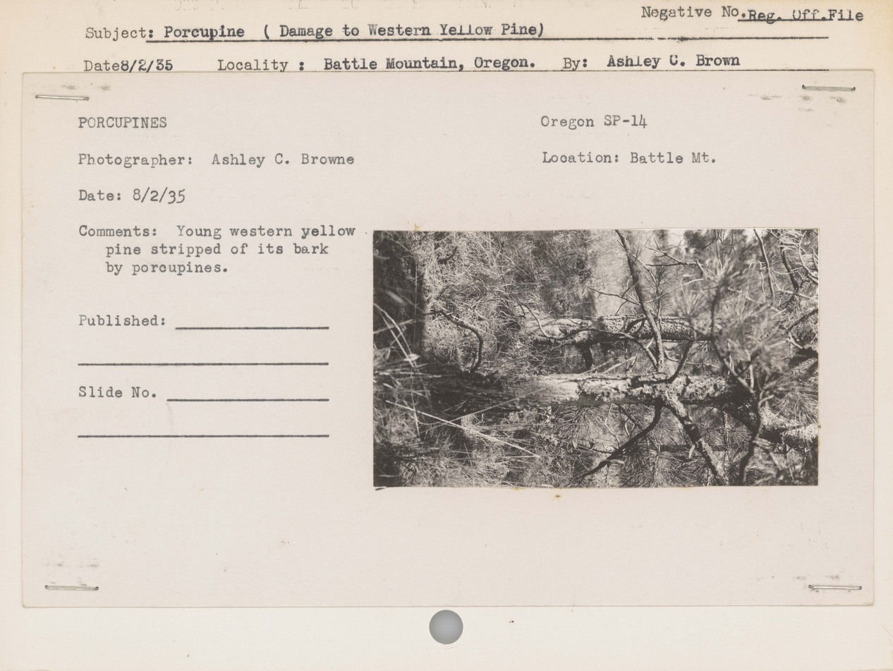 Porcupine (Damage to Western Yellow Pine). Locality: Battle Mountain, Oregon. No negative on file. Young western yellow pine stripped of its bark by porcupines.