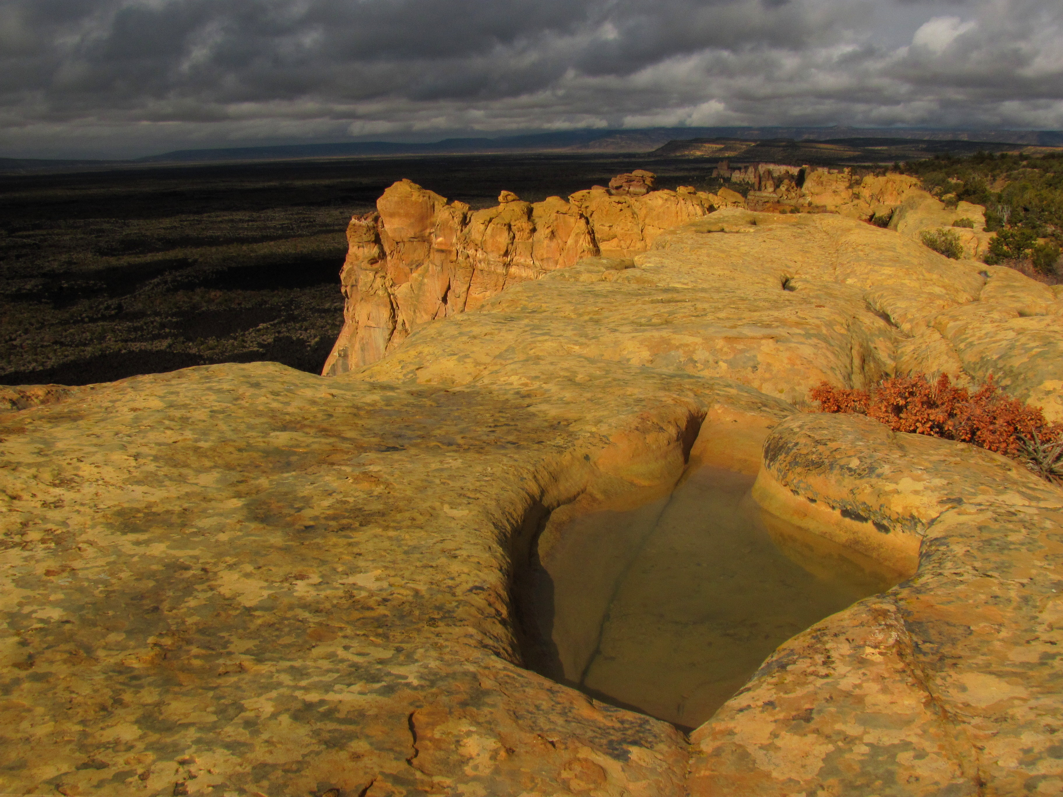 Afternoon sun highlights Sandstone Bluffs and a tinaja on a stormy day.