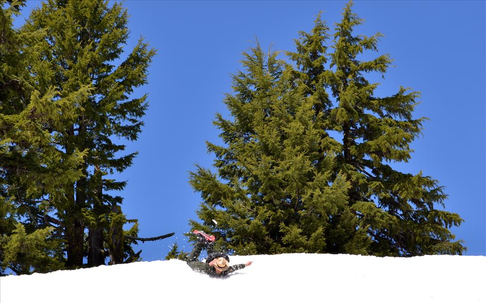 A ranger on snowshoes slides down a snow slope at Crater Lake.