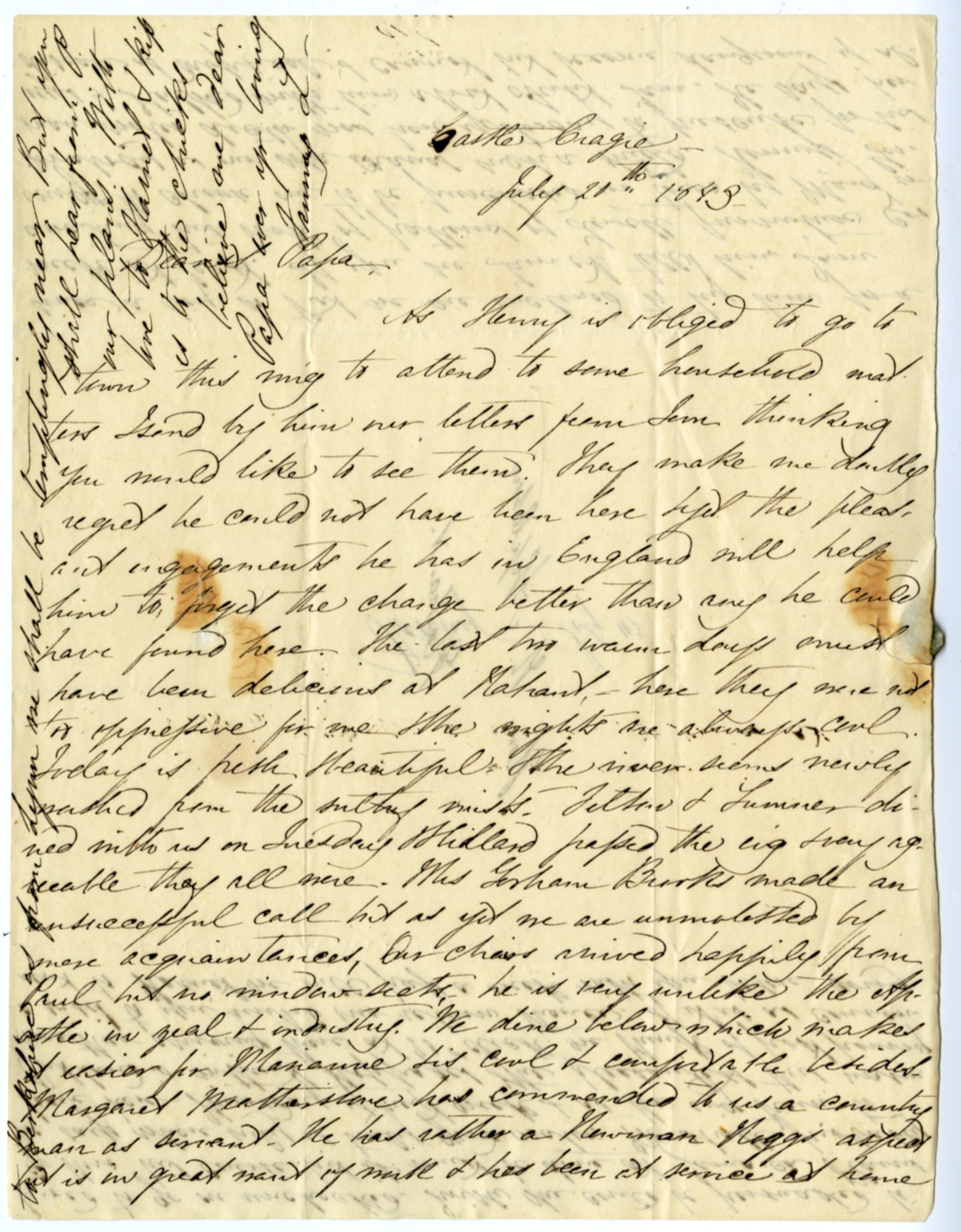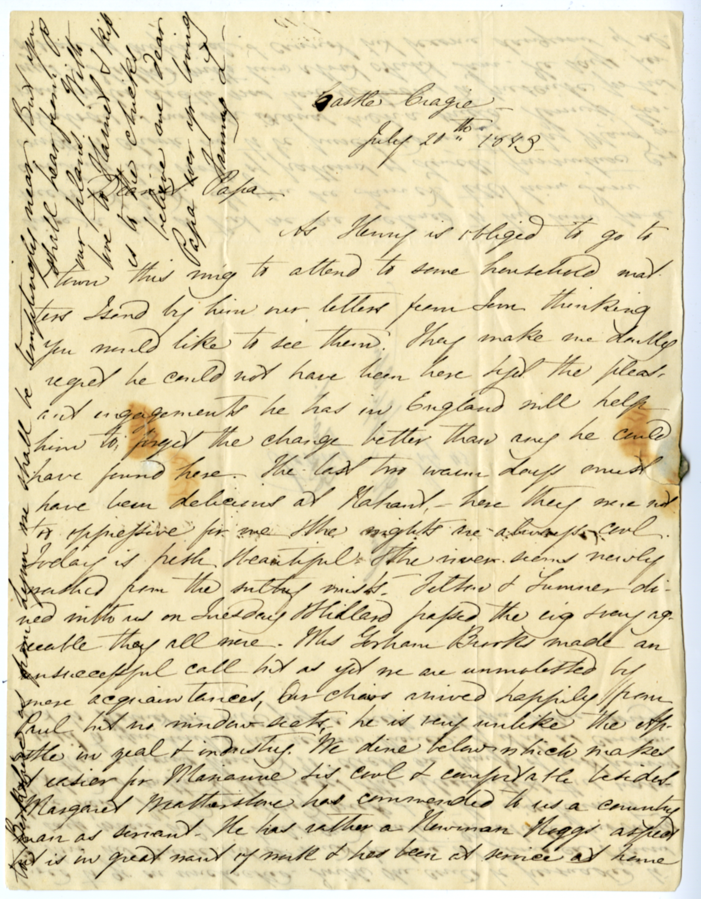 As Henry is obliged to go to town this mn’g to attend to some household matters, I send by him our letters from Wm [Sam?] thinking you would like to see them. They make me dearly regret he could not have been here & yet the pleasant engagements he has in England will help him to forget the change better than any he could have found here. The last two warm days must have been delicious at Nahant, – here they were not too oppressive for m &, the nights are always cool. Today is fresh & beautiful, the river seems newly washed form the sultry mists. Felton & Sumner dined with us on Tuesday & Hillard passed the ev’g & very agreeable they all were. Mrs. Gorham Brooks made an unsuccessful call but as yet we are unmolested by mere acquaintances. Our chairs arrived happily from Paul, his no window seats, he is very unlike the Apostle in zeal & industry. We dine below which makes it easier for Marianne & is cool & comfortable besides. Margaret Weatherstone has commended to us a country man as servant. He has rather a Newman Noggs aspect but is in great want of work & has been at service at home [p. 2] since a boy so that we are inclined to try him for a week at least. If you see Sam A. tell him I am awaiting his book of patterns of Lowell furniture coverings to choose one to be purchased in town by Marg’t or somebody as our sofa craves such a shield. Henry’s German water doctor was here yesterday to prescribe for his eyes & I talked with him about Aunt Sam. He says her disease is tropical & cannot but become dangerous if allowed to go on unchecked. I wish she could be persuaded to go thro’ his course but it must be done at Jamaica Plains he says where only is truly good water. We shall probably leave here Thursday of next week & so the ev’g train to Portland is without stoppages & the pleasantest this warm weather arriving there at 10 o’clock we think of just having a visit to you until return thence. If it is convenient to Harriet we will pass a week with you before going [p. 1 cross] to Berkshire as from Lynn we shall be temptingly near. But you shall hear from P. our plans. With love to Harriet + kisses to the chicks. Believe me dear Papa ever yr loving
