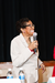 An older african american woman in a white suit stands in front of a black curtain while speaking into a microphone