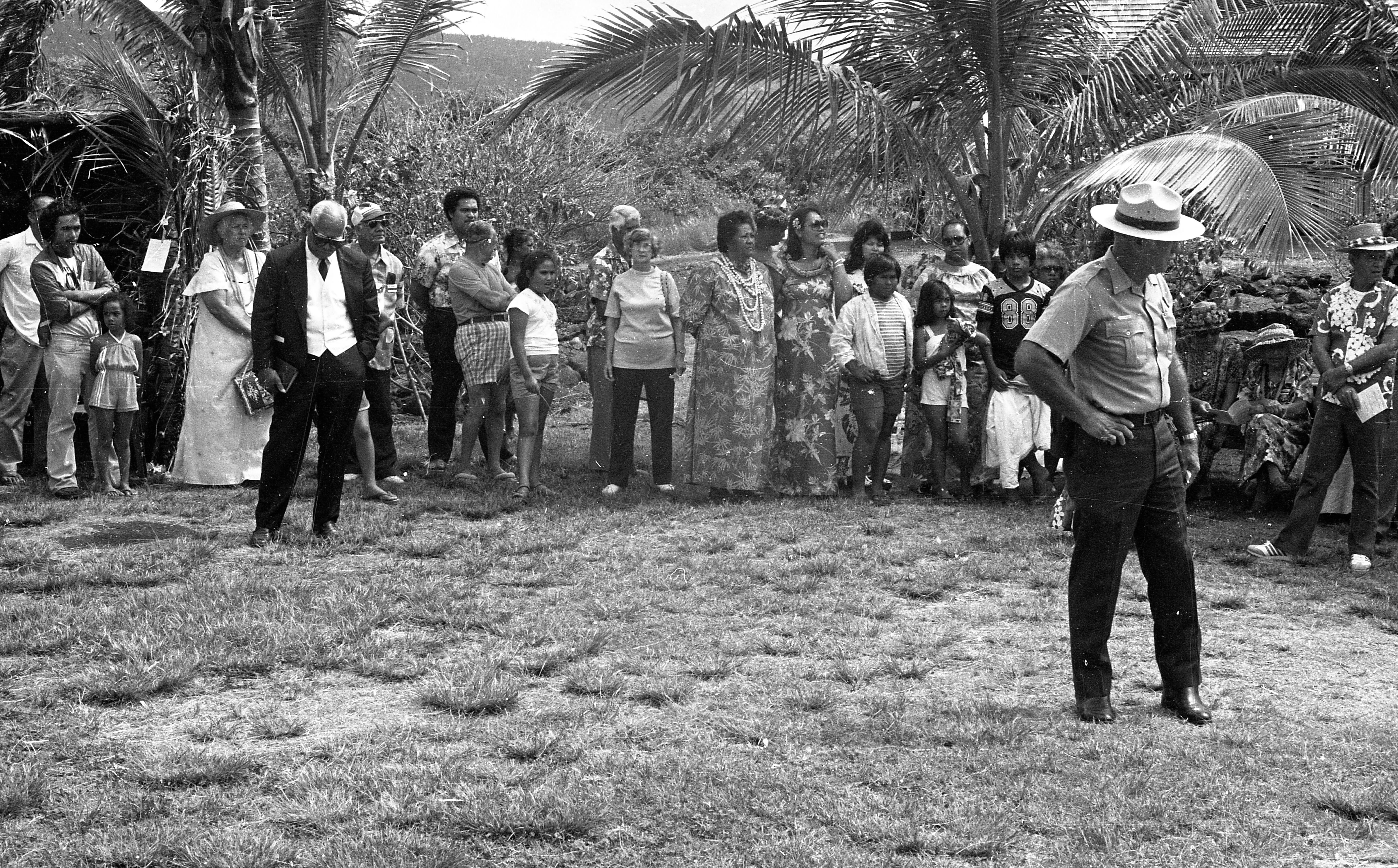 A black and white image of a park ranger giving an informational talk to visitors. The park ranger is located towards the right side of the image. He is wearing a National Park Service uniform including a ranger hat, a button down collared gray shirt with two front pockets with a name tag above the right chest pocket, pants, and boots. He is facing the right side of the image and has his right hand on his right hip. There is a crowd of people lined up behind him standing shoulder to shoulder. They are all looking at the park ranger. Behind the visitors is a row of palm plants.