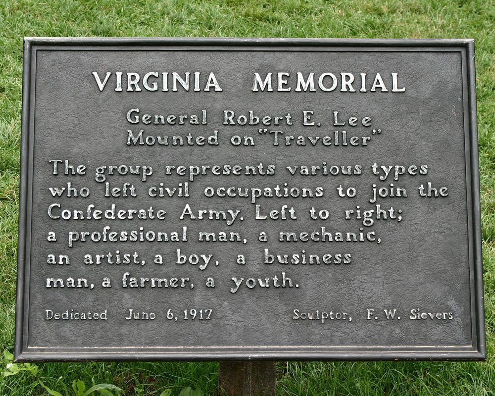 Placed on Seminary Ridge near Pt of Woods where Gen Lee watched Longstreet's Assult on July 3, 1863. Pickett's Div, made most of attack column, all Virgina regiments. Mn is near spot VA line prior to attack & where returned after failure of assult. || Equestrian statue of Gen Lee, 14' high, atop pedistal 13'7"x10'x14'. Grouping of 6 standing & 1 horseback figure, 8' high, on sculpted base, overall 18'x5'x16'. Overall Mn 41' high. Base inscribed in cut letters " Virginia to her Sons at Gettysburg."
