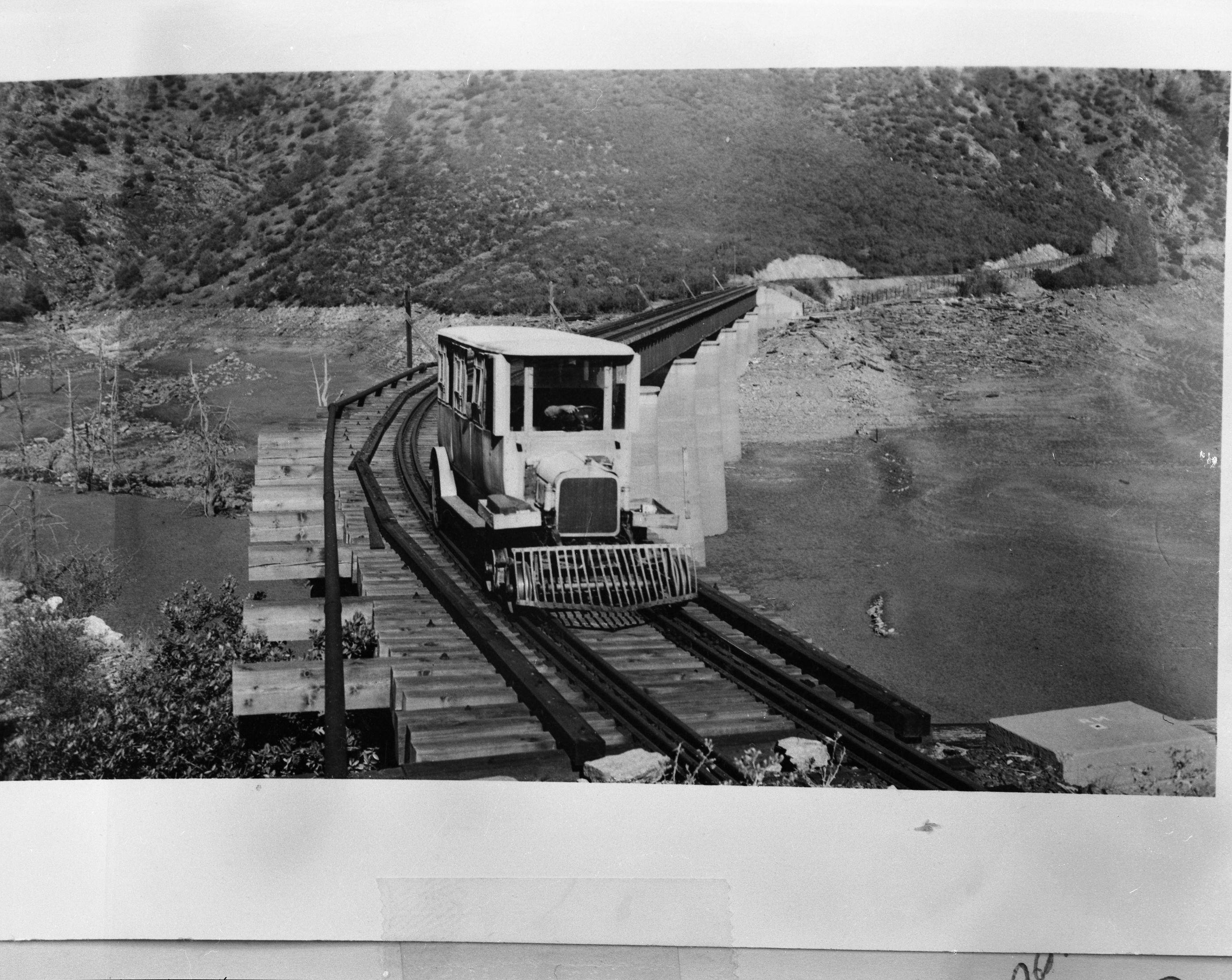 Copy Neg: Leroy Radanovich, December 2001. Gasoline rail car (vintage, unknown). Hetch Hetchy in background.