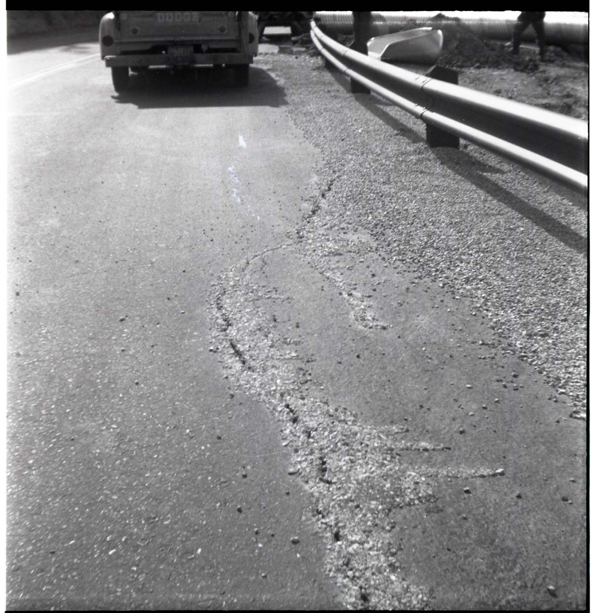 BW photos of rock slides in Kolob Canyons - 2x2. Ranger with camera reaching into crack in the road. ; ZION Museum and Archives Image 107_06_23012 ; ZION 15933