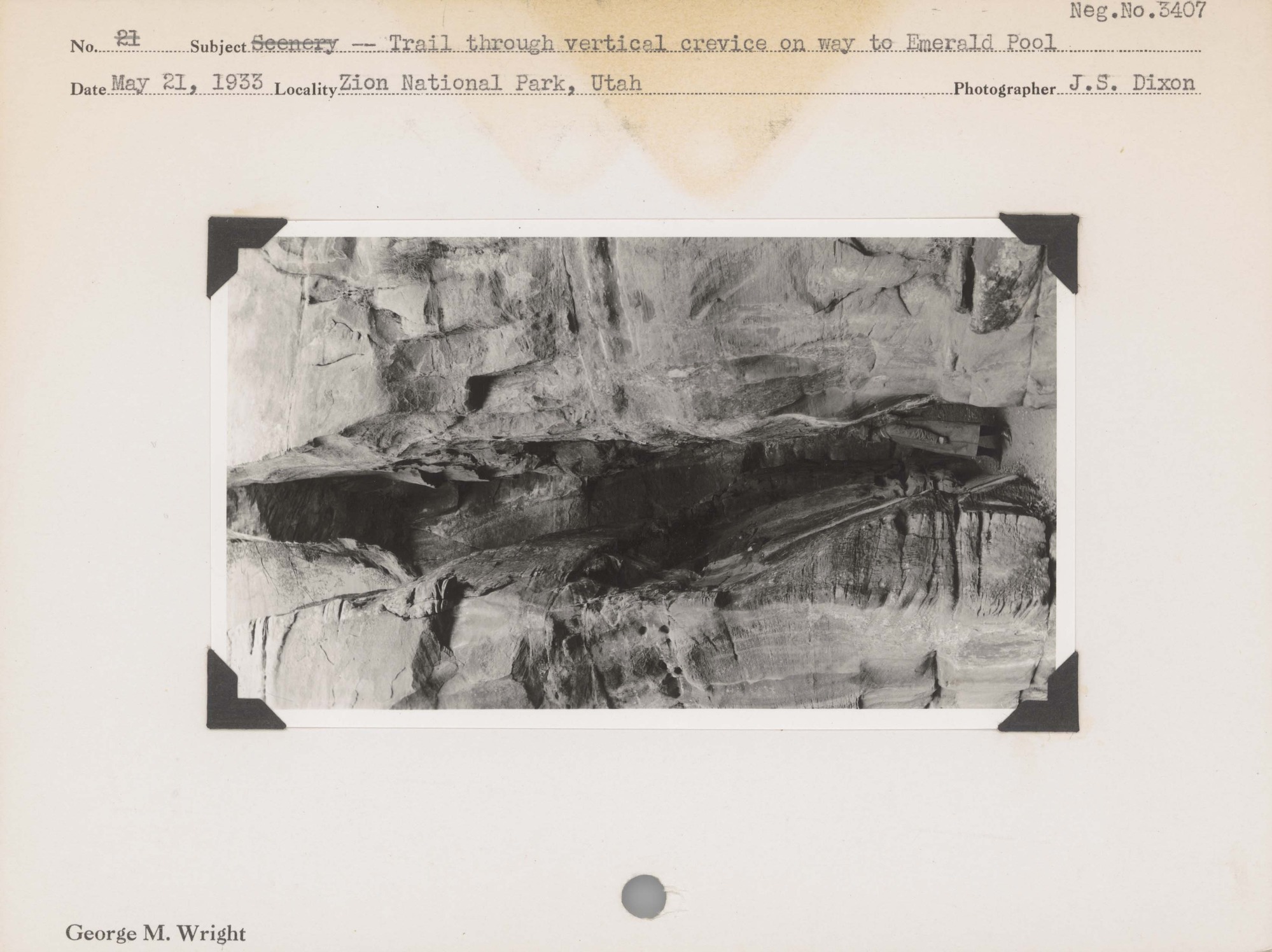 Trail through vertical crevice on way to Emerald Pool. Negative #: 3407. Locality: Zion National Park, Utah.