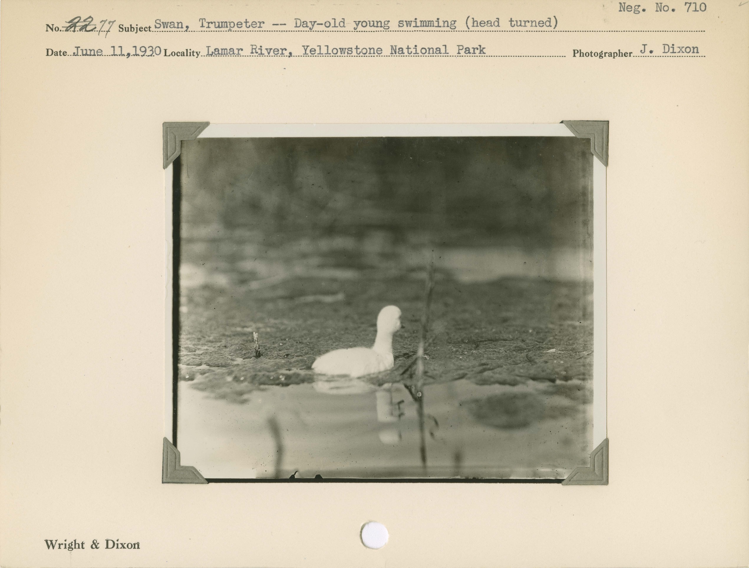 Swan, Trumpeter -- Day-old young swimming (head turned). Locality: Lamar River, Yellowstone National Park. Negative #: 710