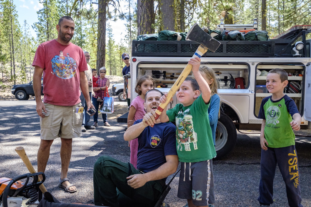A young visitor holds up a firefighter's axe.
