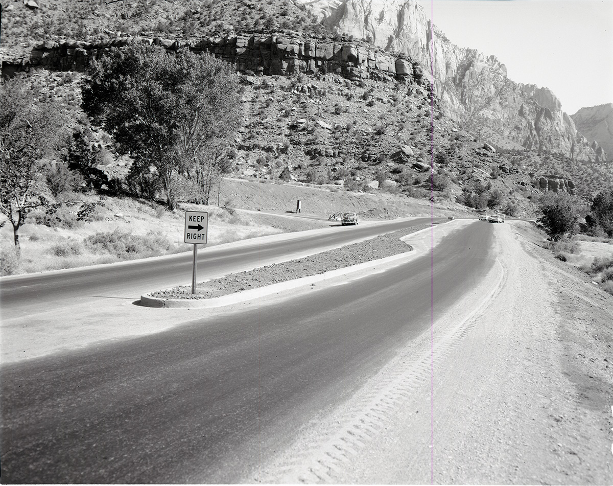 Traffic separator for the realignment of Highway 1 (park highway, State Route 9), at Mission 66 Visitor Center and Museum. ; ZION Museum and Archives Image 002_10026 ; ZION 7539