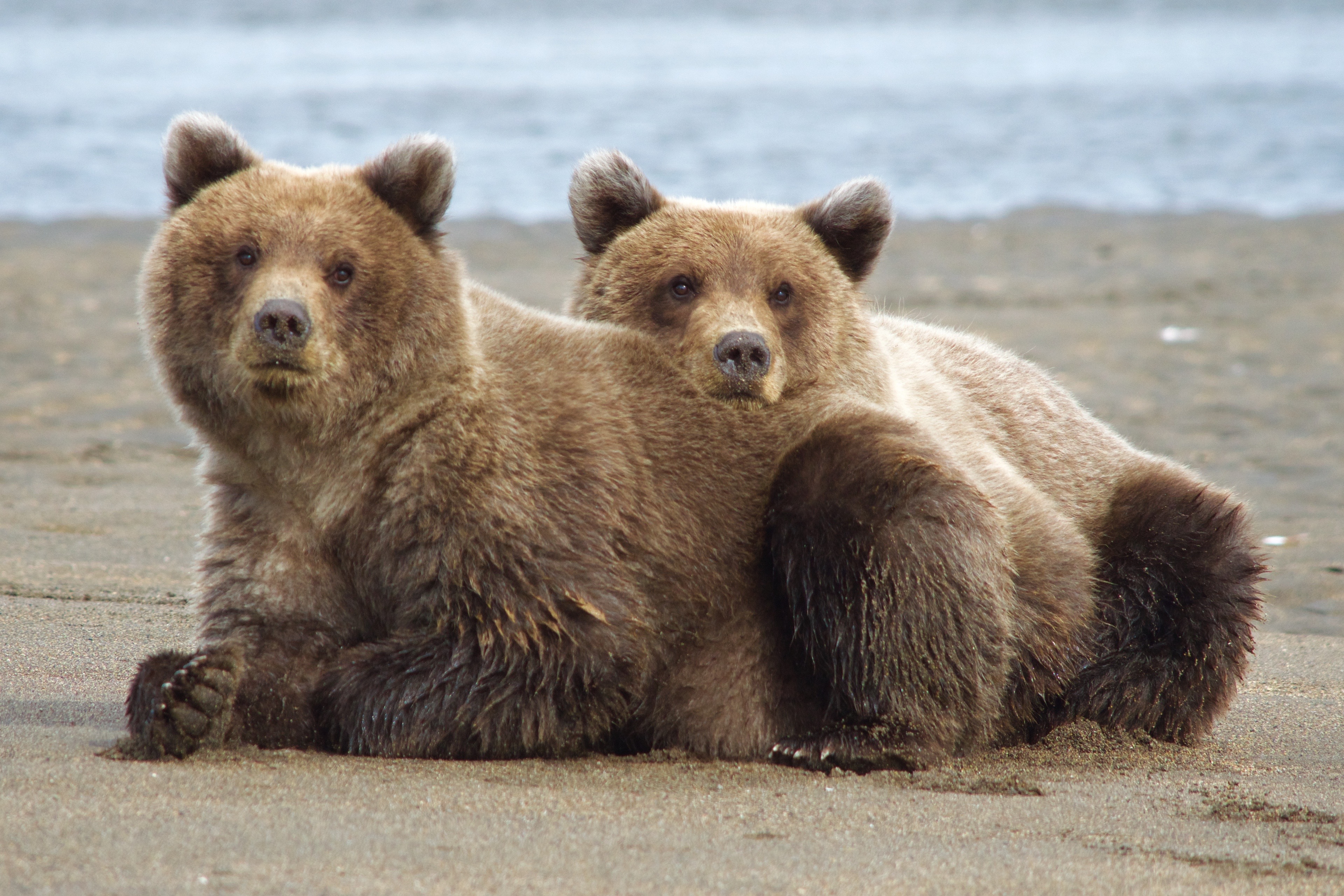 Two yearling cubs resting on the beach leaning against each other
