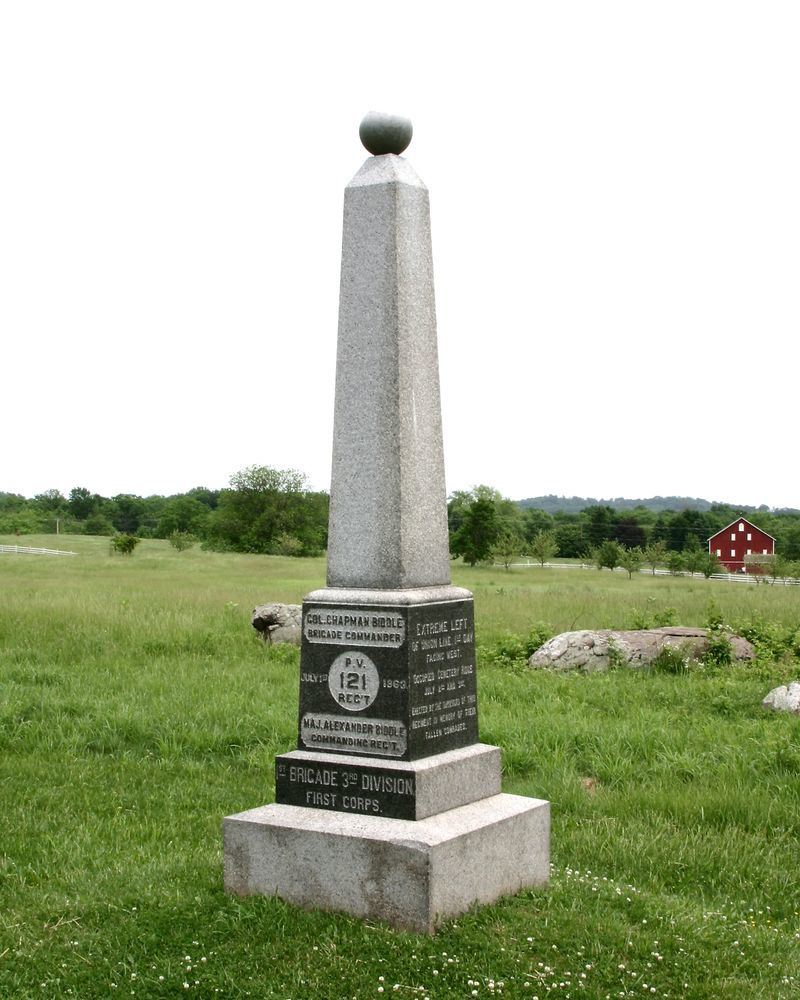 1 of 110 Pennsylvania Mn. Indicates position held by 121st Infty July 2-3, 1863. Located E side Hancock Ave S of US Regulars Mn. || Mn, base 3'6.5"sq. 3 part shaft. 1st part polished face w/incised letters. 2nd polished faces w/incised inscriptions all sides. 3rd finished stone obelisk. Topped by granite ball. All 11'3"H. Moved to present in-line location 1888-89.