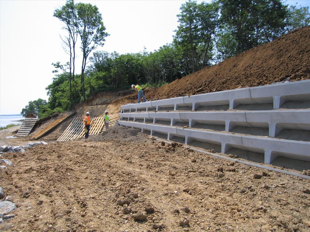Project included raising the level of riprap around the shoreline of the bluff, constructing an eight foot wide path around the toe of the bluff, constructing a concrete cell wall at the base of the slope, and regarding the top thirty feet of the bluff. The repairs were concentrated along a section of fluff located along the northwest corner of the unit. The repairs generally included raising he height of approximately 650 feet of the existing riprap revetment along the shoreline of the two rivers; removal of vegetation and loose and unstable soil from the toe and face of the bluff; constructing a 450 foot long low height pre-cast concrete retaining wall at the base of the bluff; and then backfilling behind the wall and against the existing slope with an open graded coarse aggregate to control drainage. The top of the wall was built to elevation 16 feet NVGD. A geotextile was used as a filter media to separate the natural soils from the coarse aggregates. The finished slop behind the wall was maintained at a 2 horizontal to 1 vertical slope. An additional 890 tons of riprap was added to the height of the revetment along the project shoreline and thereby provide additional storm protection to the area. The area between the revetment and the retaining was backfilled and a small path was maintained between the toe of the wall and the riprap revetment for public and park access. The finished slope was covered with a geo-cell geo-textile which was filled with topsoil and seeded.