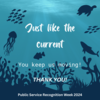 -Under the sea with some ocean plants at the bottom and ocean animals swimming like a turtle, fish, a shark, and jelly fish. Text says, "Just like the current, you keep us moving. Thank you! Public Service Recognition Week 2024."
