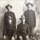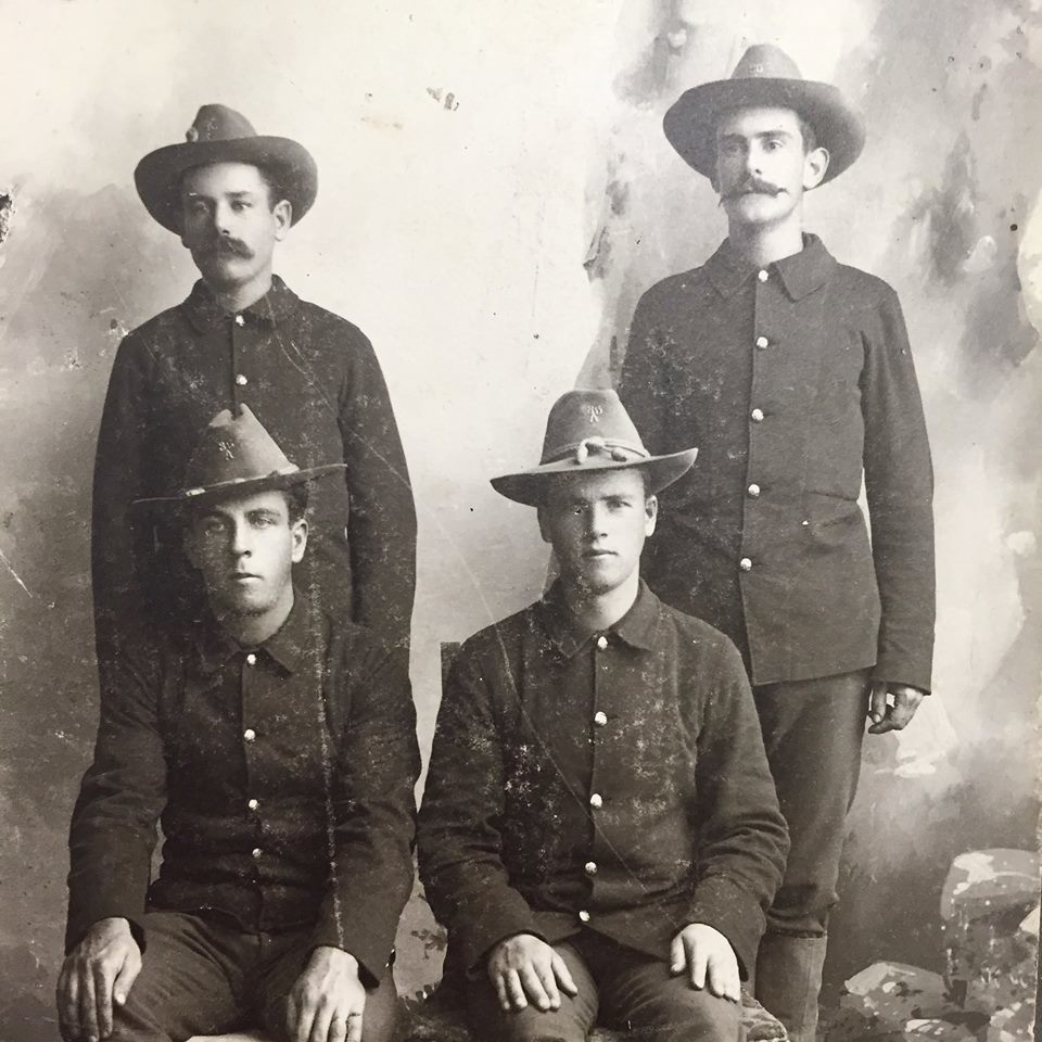 Pictured are four of the soldiers stationed at Vancouver barracks with the 35th Regiment Volunteer Infantry, Company A. The 35th was organized at the barracks in July 1899 and sailed from Portland for Manila to fight in the Philippine-American War October 4, 1899. Standing L-R: Barney Beatty and Joseph J Porter. Seated L-R: Tom Murphy and Artie Beatty.